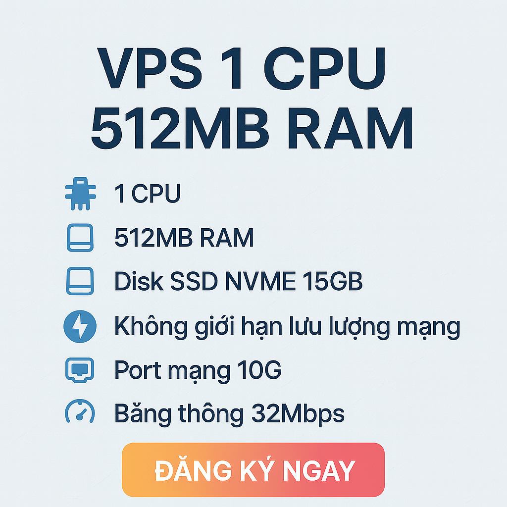 Bạn cần một máy chủ nhỏ gọn, tốc độ cao, chi phí hợp lý để chạy tác vụ nhẹ? VPS 1 CPU 512MB RAM tại HoangTuTech.com mang lại hiệu năng ổn định, dữ liệu không giới hạn, bảo mật cao.