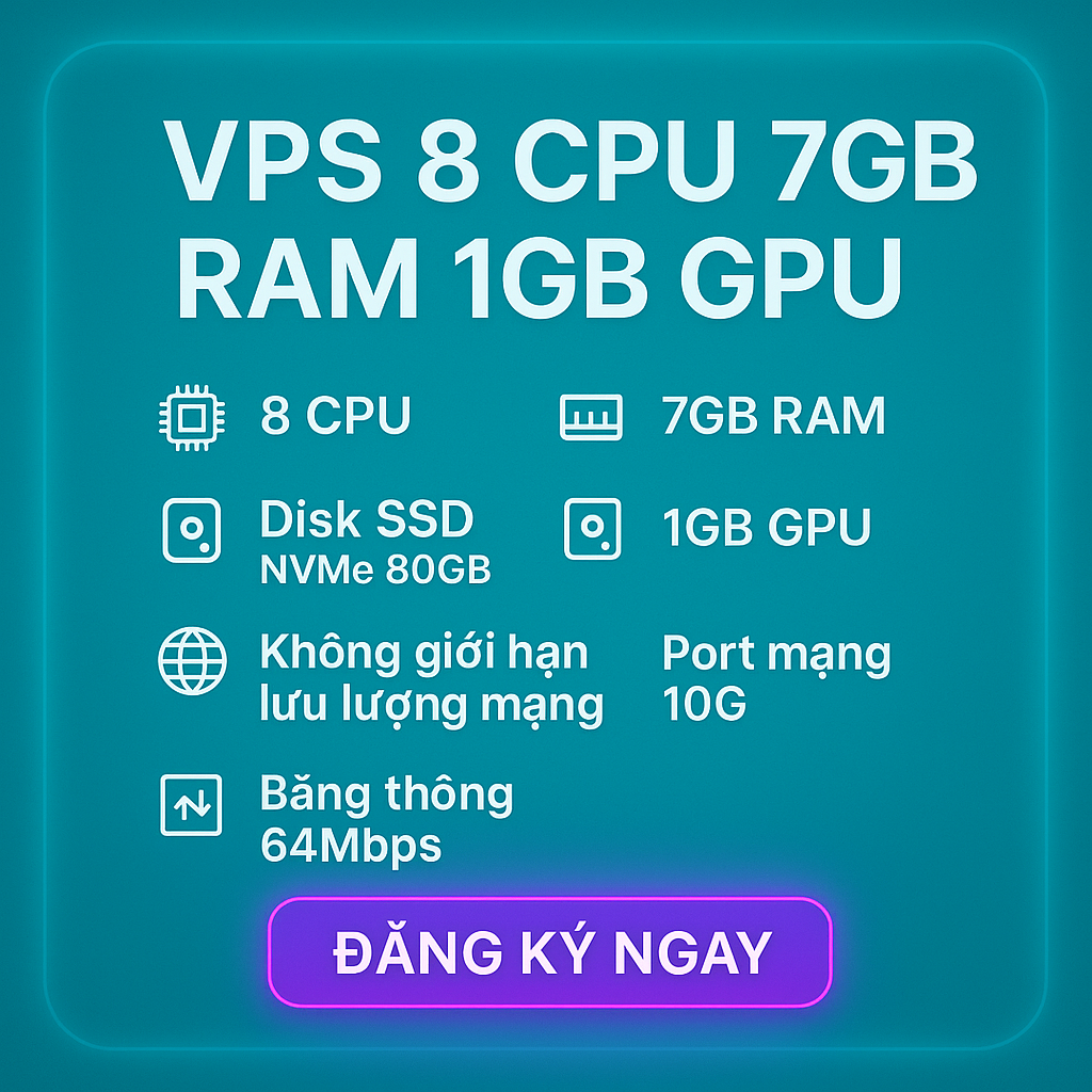 👉 VPS 8 CPU – 7GB RAM – GPU 1GB tại HoangTuTech chính là lựa chọn tối ưu cho nhu cầu này.