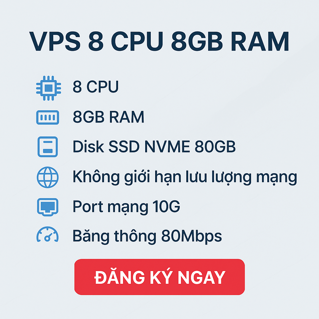 Với 8 CPU, 8GB RAM, ổ NVMe 80GB, port 10G và băng thông 80Mbps, đây là gói VPS hiệu năng cao nhưng vẫn tối ưu chi phí.